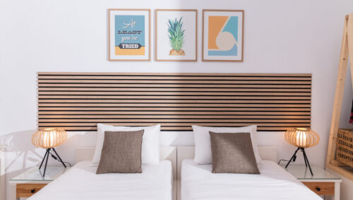 Earthy tones and twin beds in a minimal, bright space made for restful moments